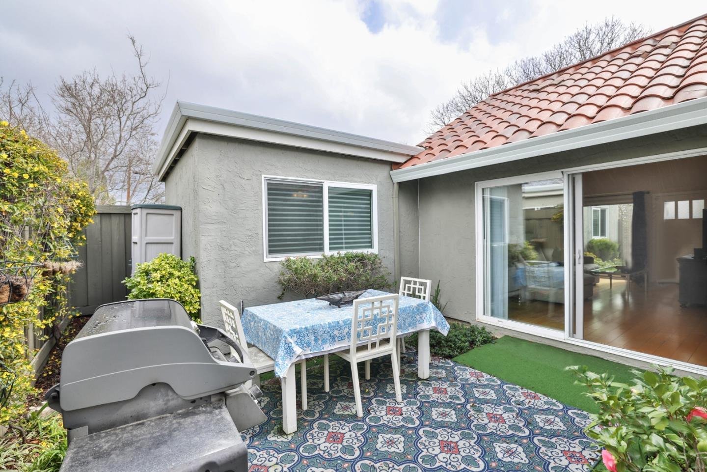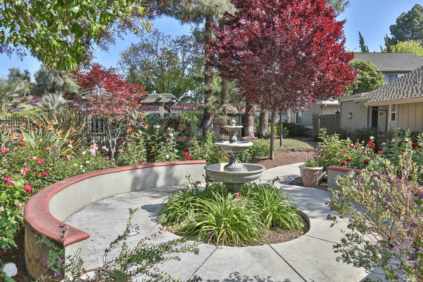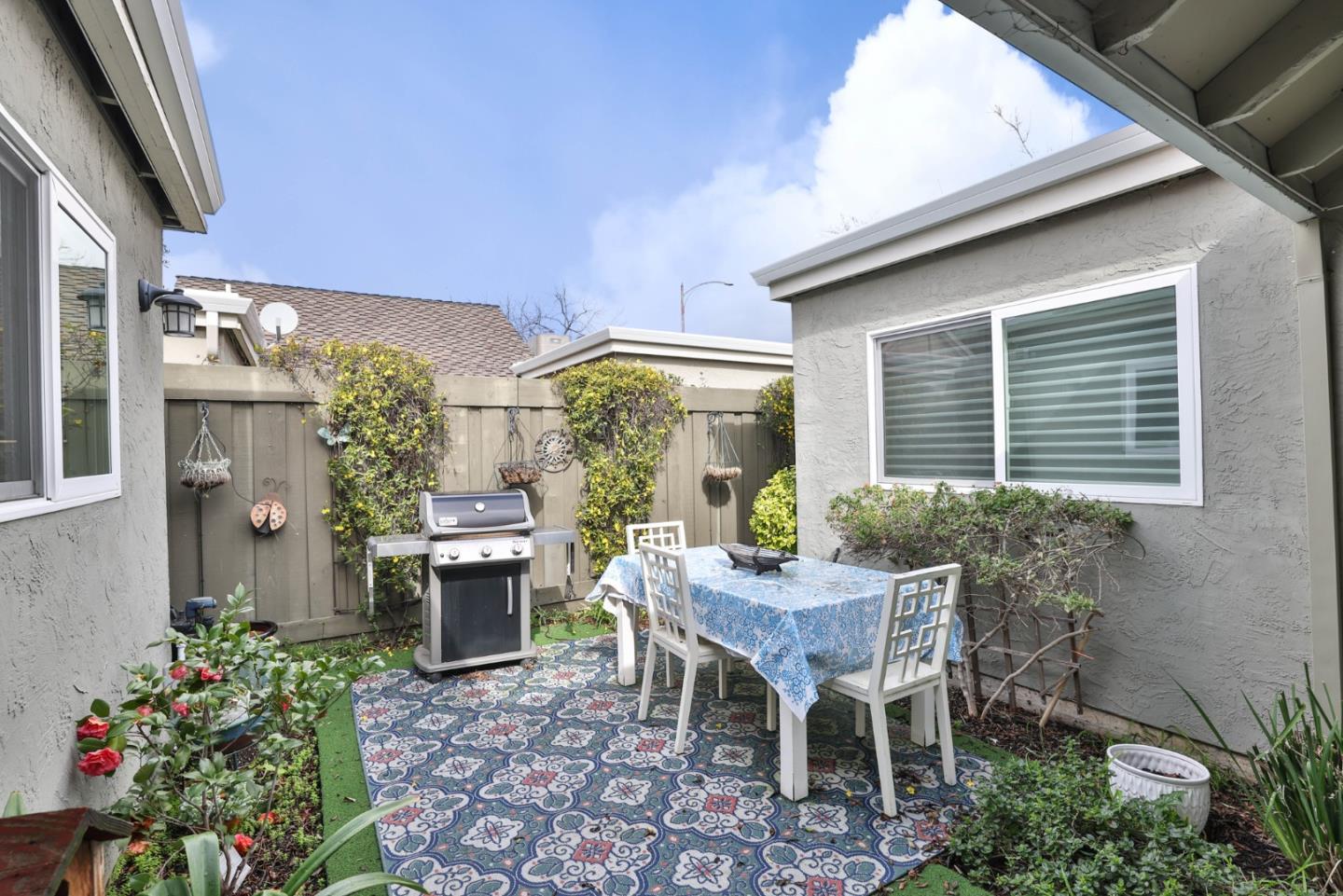 An epitome of luxury and convenience in Peppertree Complex! This single story end unit has been thoroughly renovated showcasing high-end quality finishes. As you step inside, you're greeted by hardwood floors that flow seamlessly. The kitchen is a chef's dream, featuring top-of-the-line cabinets, stainless steel appliances (including an electric stove with double oven), and a charming farmhouse sink w/ views of the private patio. The adjacent dining area is adorned w/ a built-in buffet and glass cabinets. The spacious living room boasts vaulted ceilings and recessed lighting enhances its warm ambiance.. The outdoor space is a serene oasis, complete with artificial turf, lush plants, and a convenient shed that stays with the property. The primary bedroom is a retreat unto itself, offering two closets with built-in organizers. The master bathroom is equally impressive, with ample space and tasteful renovations. Highly functional home with two-panel interior doors, a finished 2-car attached garage equipped with cabinets and a custom-built fold-out workshop table, as well as indoor laundry featuring stackable units and built-in cabinets. Complex- landscaped common area, large pool & cabana, BBQ island,rose garden & RV parking. Enjoy shopping, restaurants, and popular farmers market.