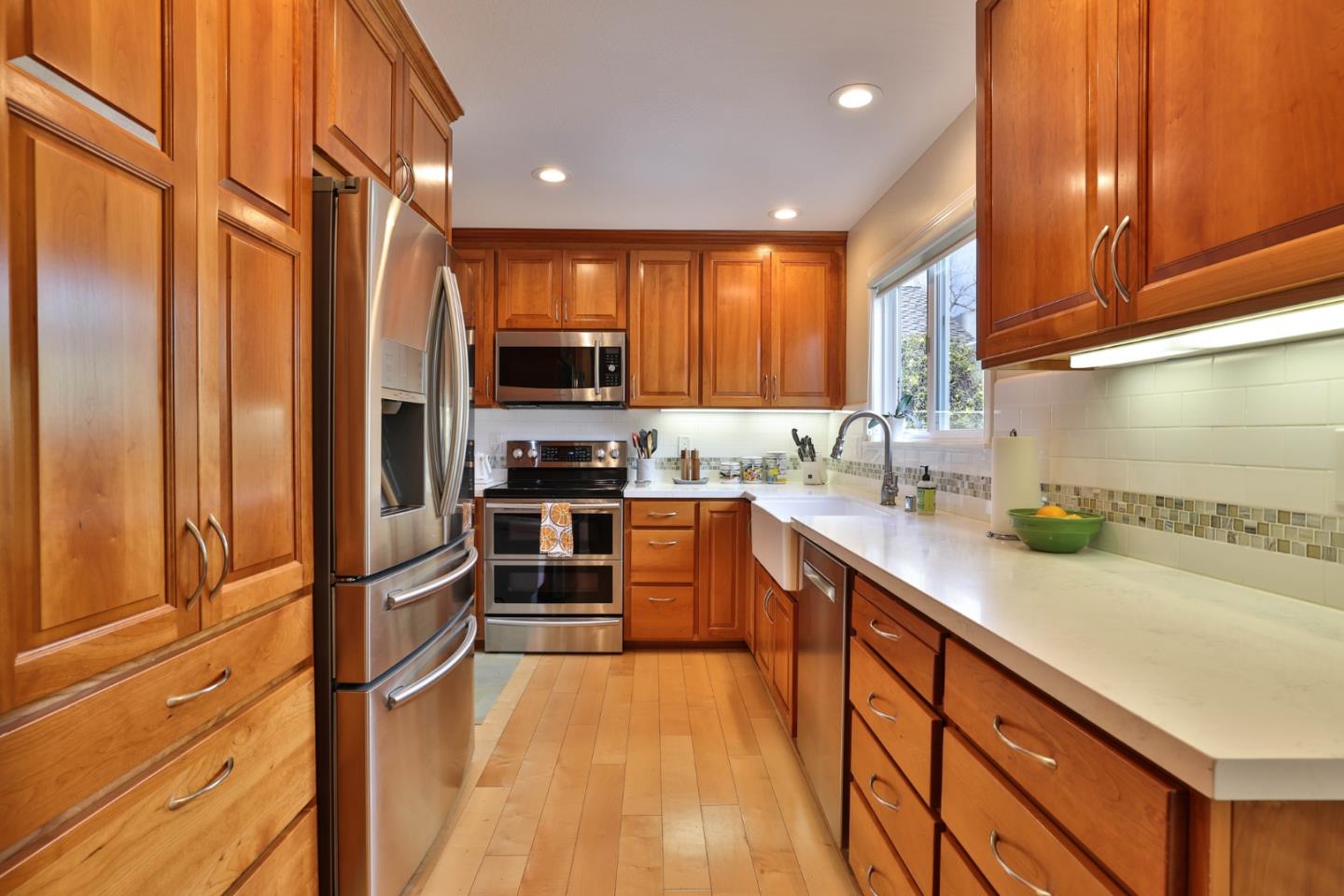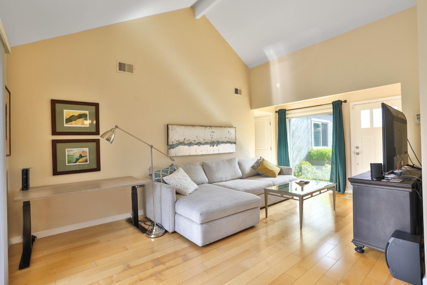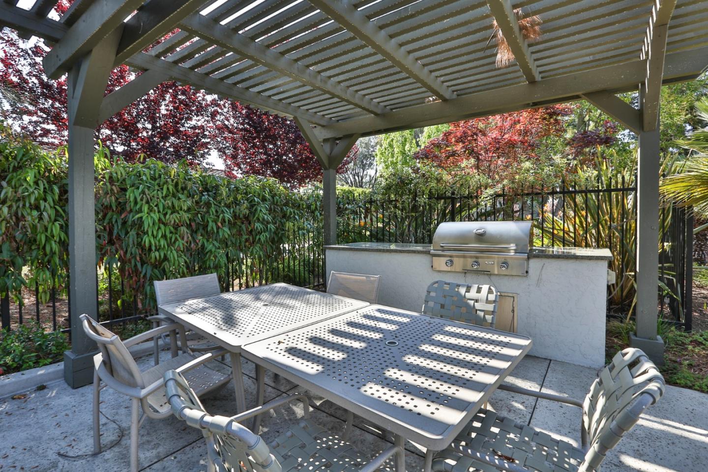 An epitome of luxury and convenience in Peppertree Complex! This single story end unit has been thoroughly renovated showcasing high-end quality finishes. As you step inside, you're greeted by hardwood floors that flow seamlessly. The kitchen is a chef's dream, featuring top-of-the-line cabinets, stainless steel appliances (including an electric stove with double oven), and a charming farmhouse sink w/ views of the private patio. The adjacent dining area is adorned w/ a built-in buffet and glass cabinets. The spacious living room boasts vaulted ceilings and recessed lighting enhances its warm ambiance.. The outdoor space is a serene oasis, complete with artificial turf, lush plants, and a convenient shed that stays with the property. The primary bedroom is a retreat unto itself, offering two closets with built-in organizers. The master bathroom is equally impressive, with ample space and tasteful renovations. Highly functional home with two-panel interior doors, a finished 2-car attached garage equipped with cabinets and a custom-built fold-out workshop table, as well as indoor laundry featuring stackable units and built-in cabinets. Complex- landscaped common area, large pool & cabana, BBQ island,rose garden & RV parking. Enjoy shopping, restaurants, and popular farmers market.
