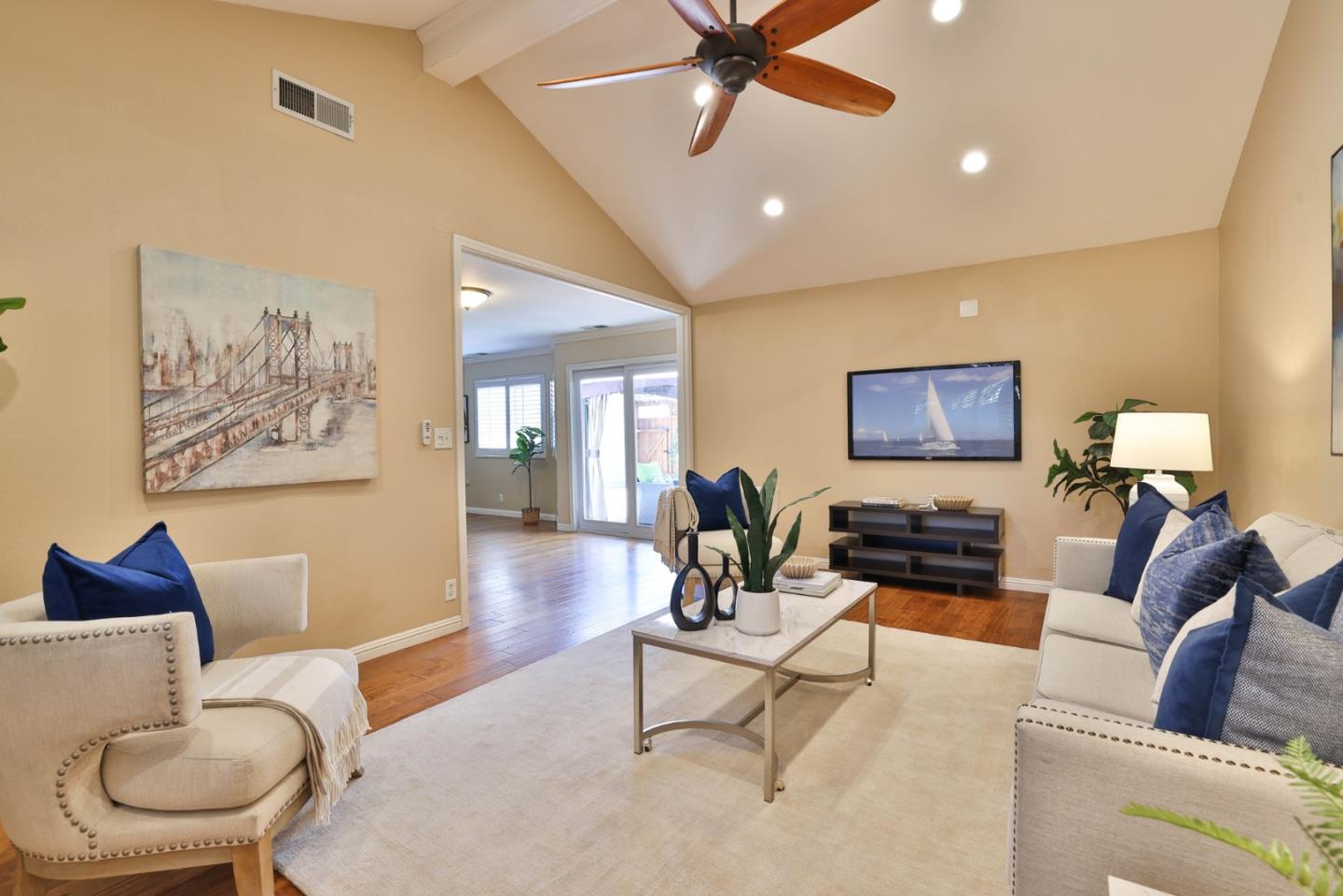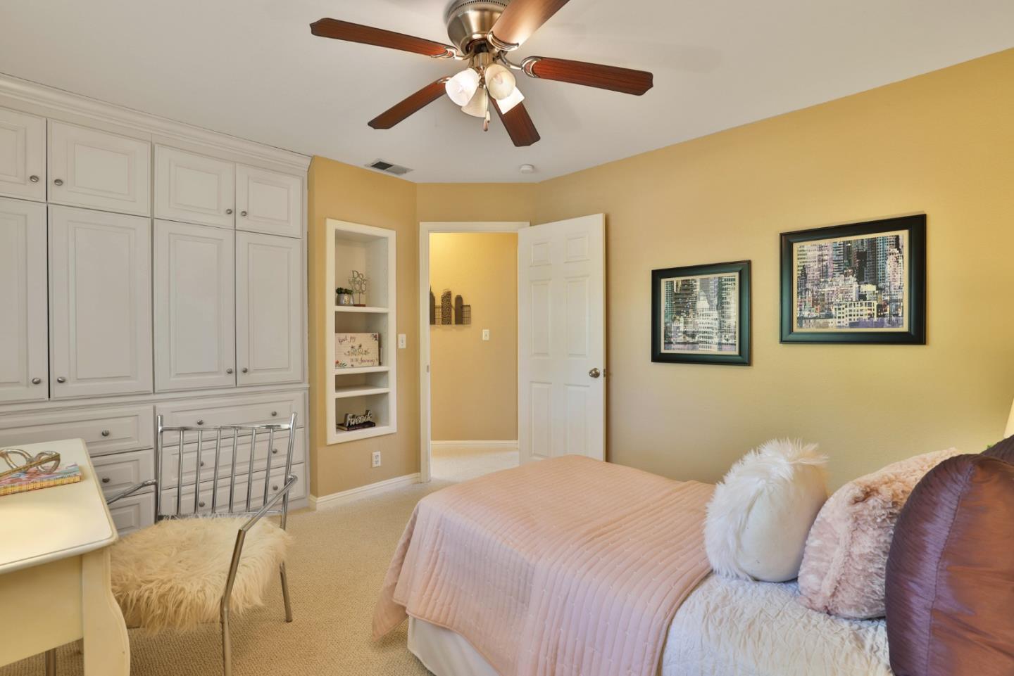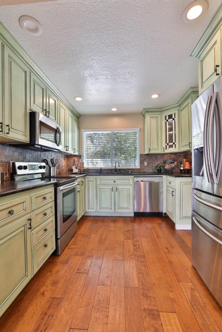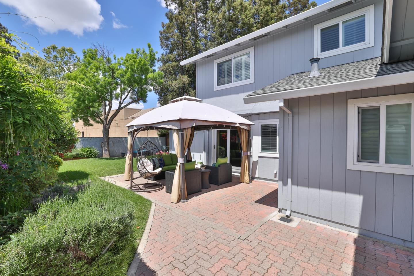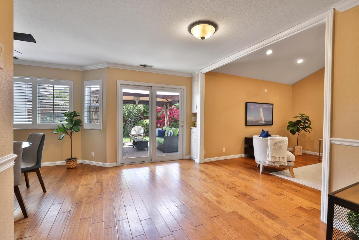 Beautiful Blossom Valley townhome featuring the largest backyard in the community! Enjoy the spacious living room with soaring vaulted ceilings perfect for entertaining and gorgeous wood flooring. Kitchen with beautiful stone countertops and unique stone backsplash, walk-in pantry, and stainless steel appliances. The eat-in kitchen is ideal for entertaining, with large windows that flood the space with natural light. Upstairs, the primary bedroom features ample natural light and a spacious en suite bathroom with a fully tiled bathtub and shower combination. The guest bedroom offers built-in cabinets for extra storage and a dedicated bath. The large backyard is perfect for entertaining or dining al fresco on the patio. Featuring abundant storage, including a spacious attic and an attached two-car garage.. Close to Blossom Hill Light Rail, Oakridge Mall, Cahalan Park, freeways, shopping, restaurants and more.