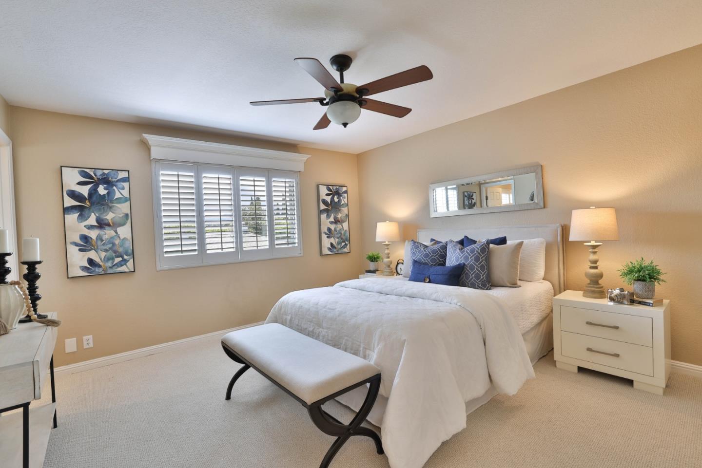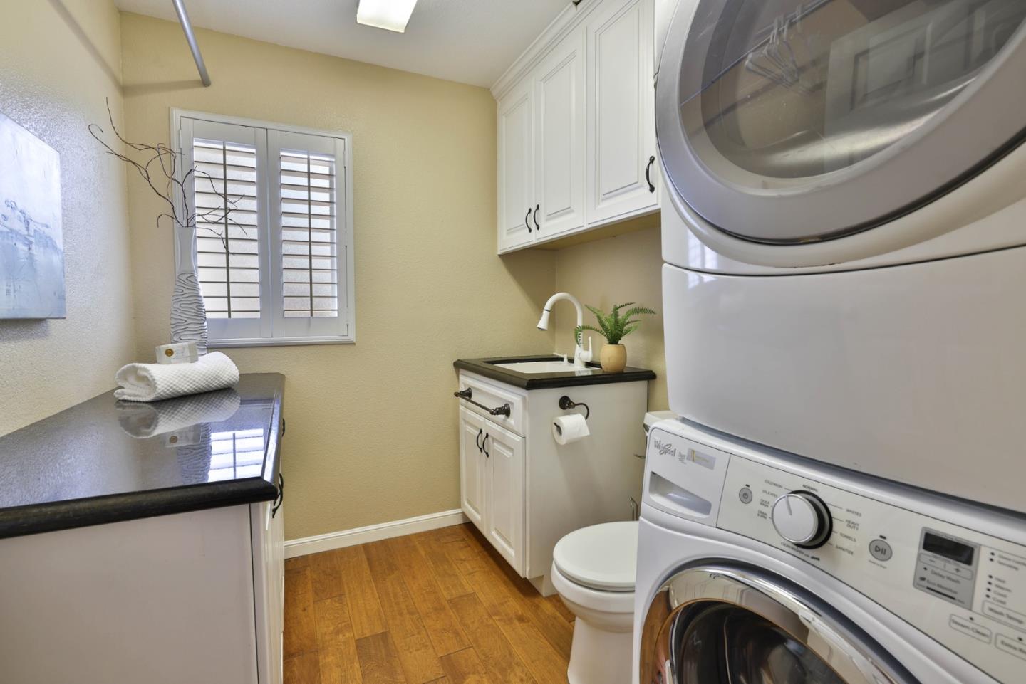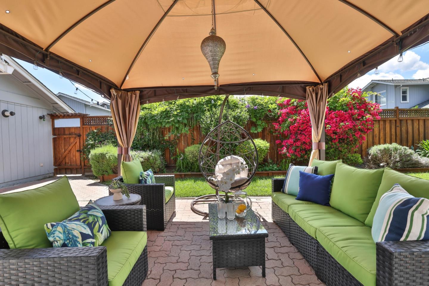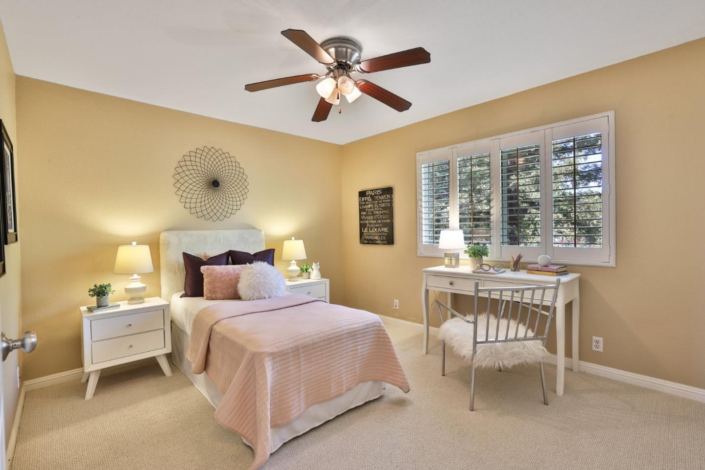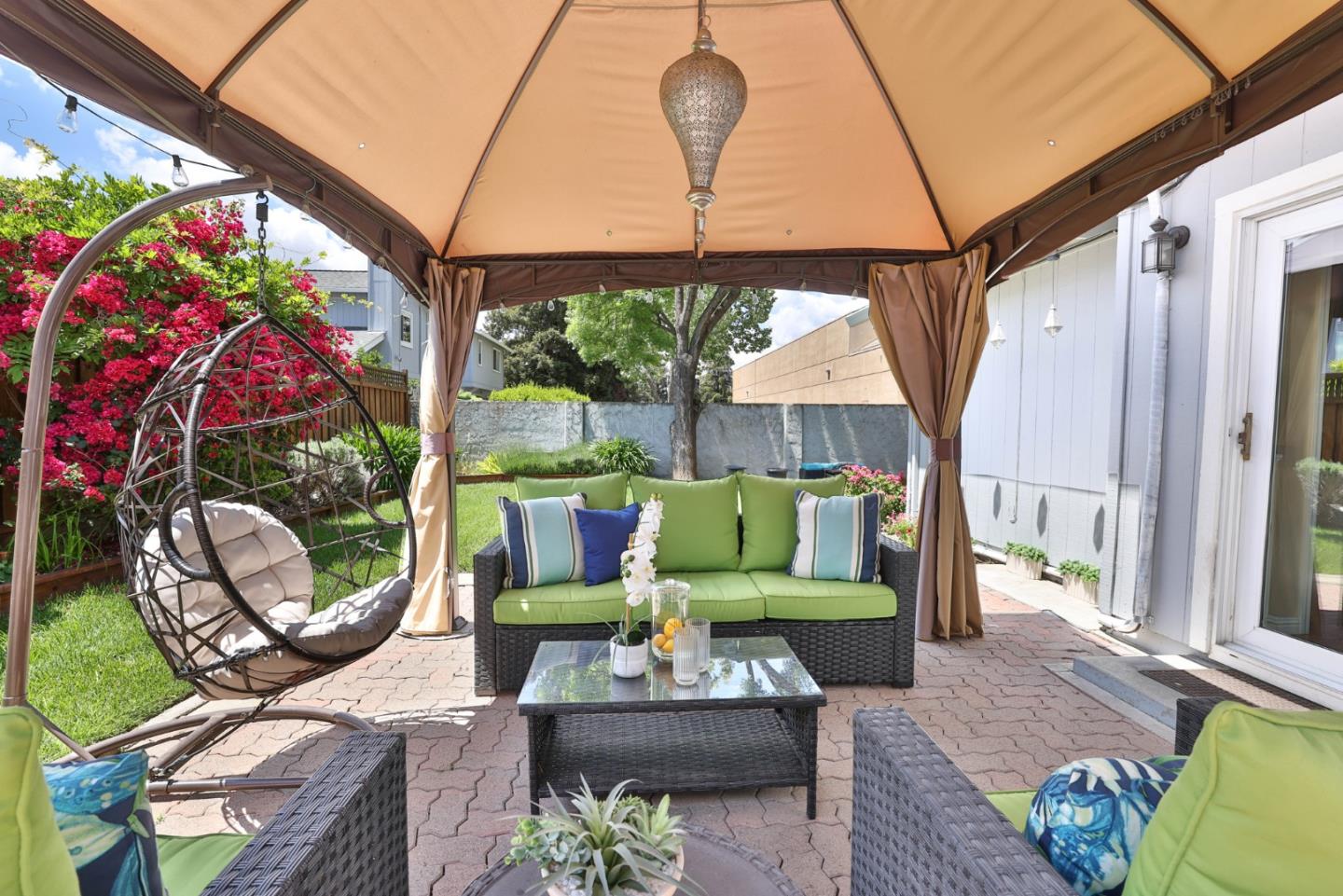 Beautiful Blossom Valley townhome featuring the largest backyard in the community! Enjoy the spacious living room with soaring vaulted ceilings perfect for entertaining and gorgeous wood flooring. Kitchen with beautiful stone countertops and unique stone backsplash, walk-in pantry, and stainless steel appliances. The eat-in kitchen is ideal for entertaining, with large windows that flood the space with natural light. Upstairs, the primary bedroom features ample natural light and a spacious en suite bathroom with a fully tiled bathtub and shower combination. The guest bedroom offers built-in cabinets for extra storage and a dedicated bath. The large backyard is perfect for entertaining or dining al fresco on the patio. Featuring abundant storage, including a spacious attic and an attached two-car garage.. Close to Blossom Hill Light Rail, Oakridge Mall, Cahalan Park, freeways, shopping, restaurants and more.