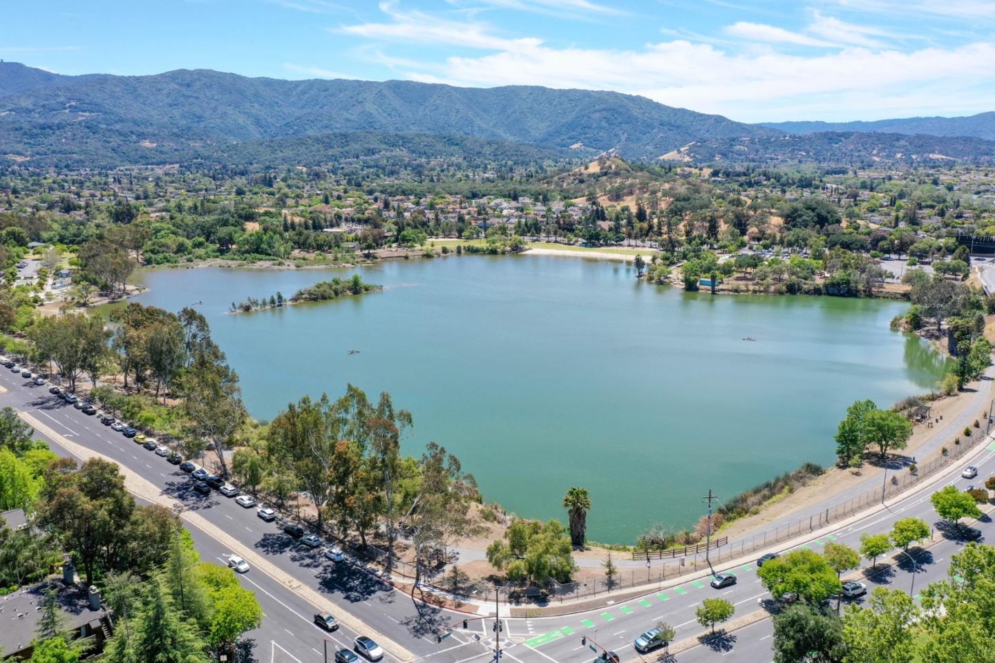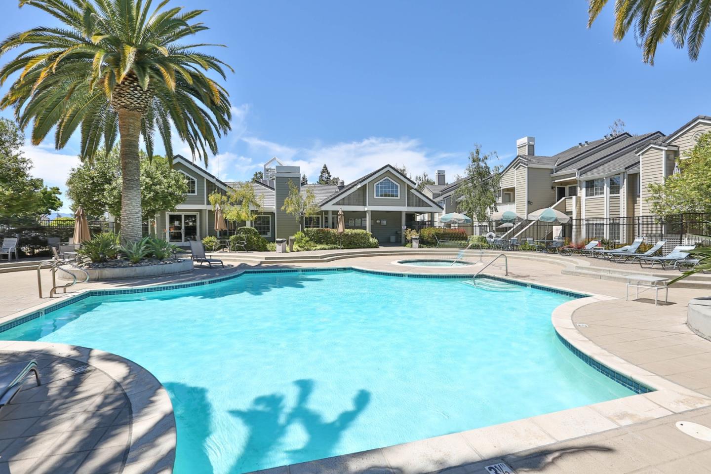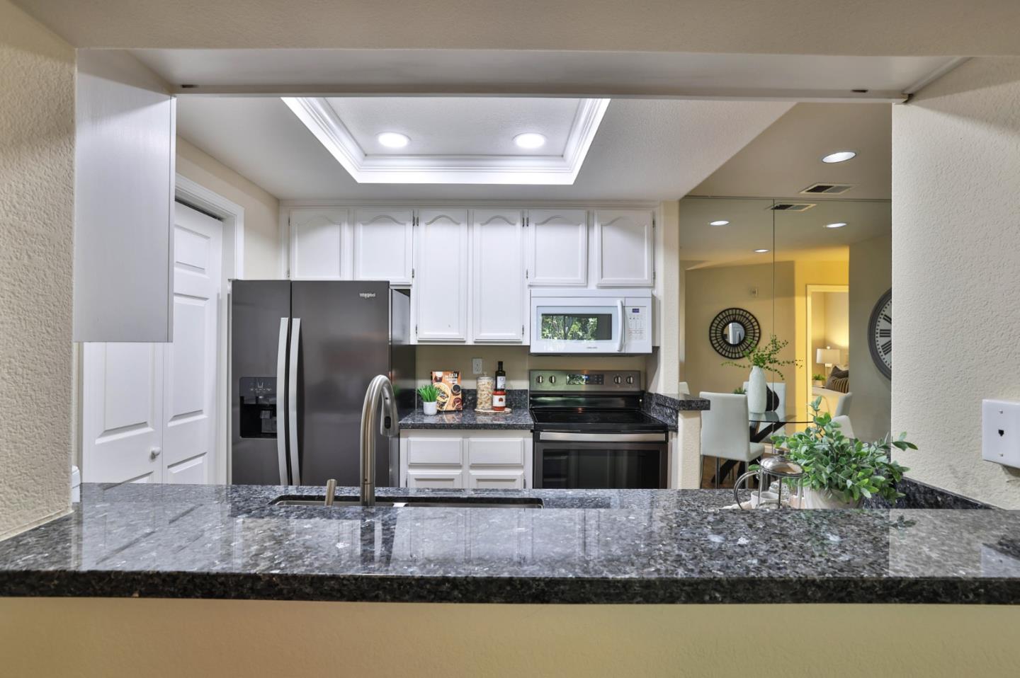 Bright & light top floor condo w/beautiful kitchen! Enjoy entertaining with granite countertops & eat-in breakfast bar! Easy-to-maintain wood floors accentuate the stunning vaulted ceilings. Enjoy the large balcony off the living room, perfect for morning breakfast w/views of community green space. The extra storage closet is a bonus. Enjoy inside utility room w/washer/dryer plus extra pantry for storage. Master bedroom has vaulted ceilings & bay-style windows w/large walk-through dual closet. The second bedroom is good sized w/large closet and vaulted ceilings. The master bathroom has dual sinks & large walk-in shower. This unit features a detached 1 car garage, and central AC perfect for those warm summer days. Walk to Almaden Lake Park, trails & shopping. Easy access to Highway 85/87, ideal for commuters! The community has 2 pools, a gym & community room with guest parking. Water is included in the HOA fee.